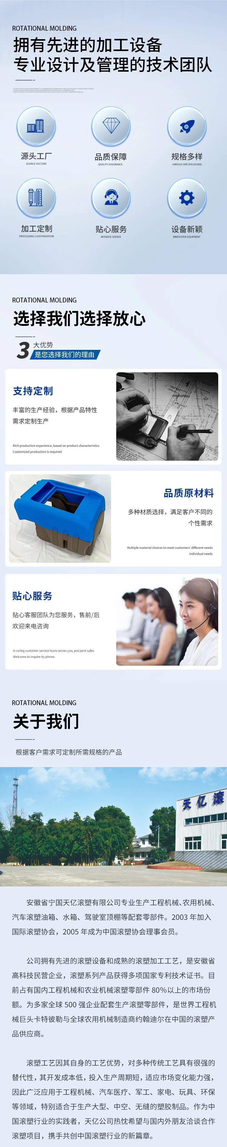 我公司制造的滚塑器材具有结构合理、重量轻、坚固经久耐用、维护成本低、密封性能优良、防水、防沙尘、防污染的优点、其抗冲击性能尤为优良。
